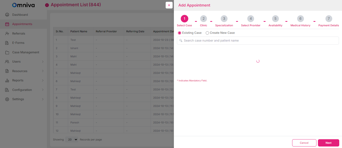 2. **Select Case Type** (**Existing Case**): A search and listing interface appears, allowing him to filter cases. A list of active case loads, displaying relevant details like case number and status. And for ongoing steps, all fields are auto-filled such as specialization, provider and medical history but you have the flexibility to change any field.<br>