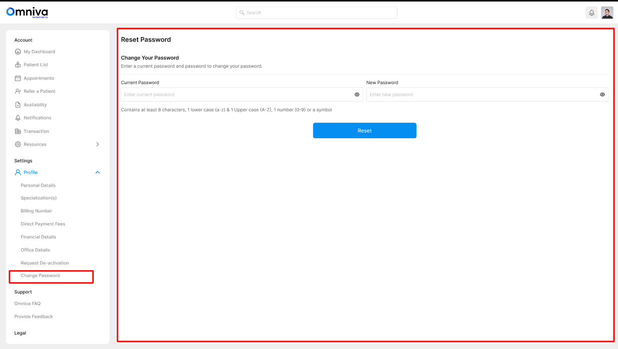* In the "Change Password" section, patients can make their account safer by choosing a new, stronger password for logging in.<br>